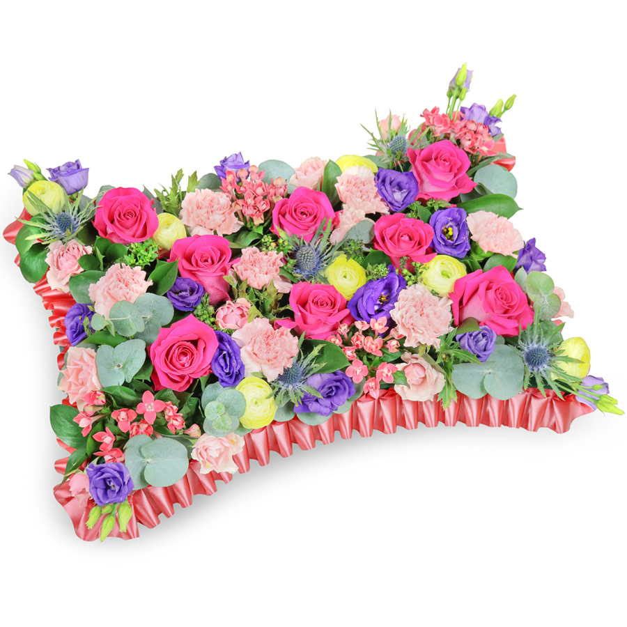 Celebrate the loveliness and uniqueness of our pillow-shaped bouquet, thoughtfully arranged with vibrant roses, elegant carnations, exquisite ranunculus, delicate lisianthus, charming bouvardia, and accented with fresh eucalyptus leaves and ruscus. Each flower is hand-selected to ensure exceptional freshness and quality.