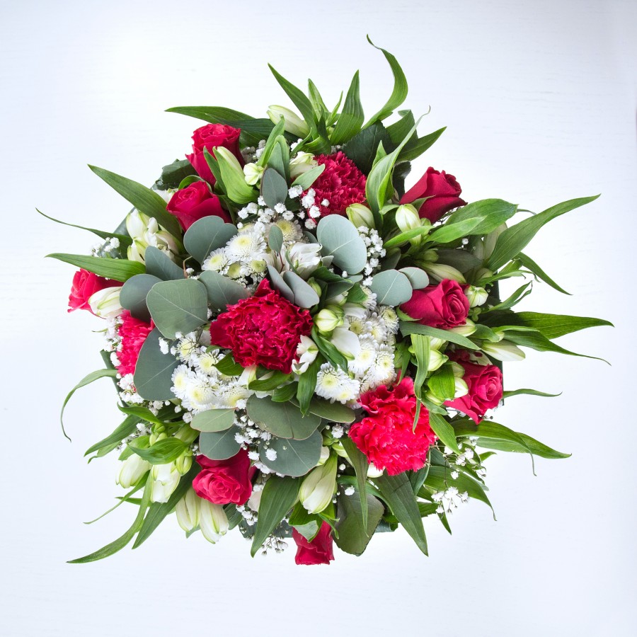 Our charming bouquet combines the purity of white chrysanthemums with the passion of red roses, creating a unique and eye-catching floral arrangement perfect for any occasion.