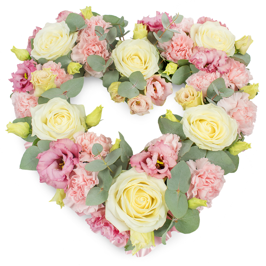 Express your heartfelt emotions with our Elegant Heart Tribute Bouquet, meticulously crafted to honor your loved one. This stunning arrangement features a harmonious blend of white roses, pink carnations, pink lisianthus, and refreshing eucalyptus leaves.